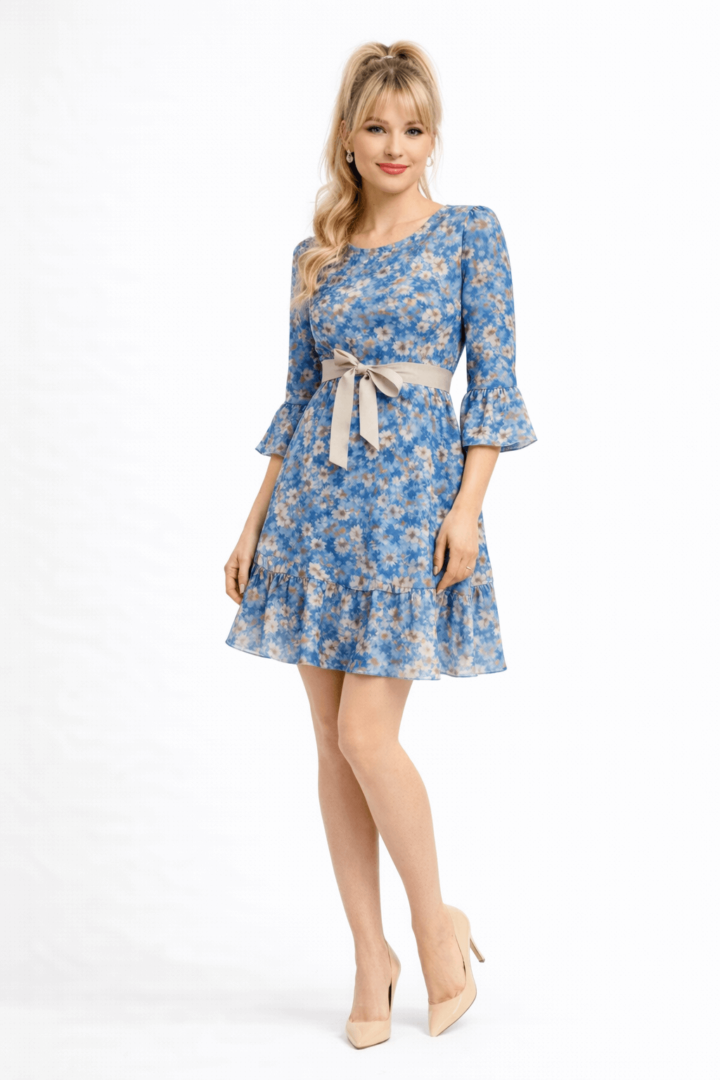 Urocza, kobieca sukienka z delikatną falbaną na dole, która pięknie się układa w ruchu. Ma śliczne rękawki 3/4 zakończone falbanką, co dodaje jej lekkości i dziewczęcego uroku.