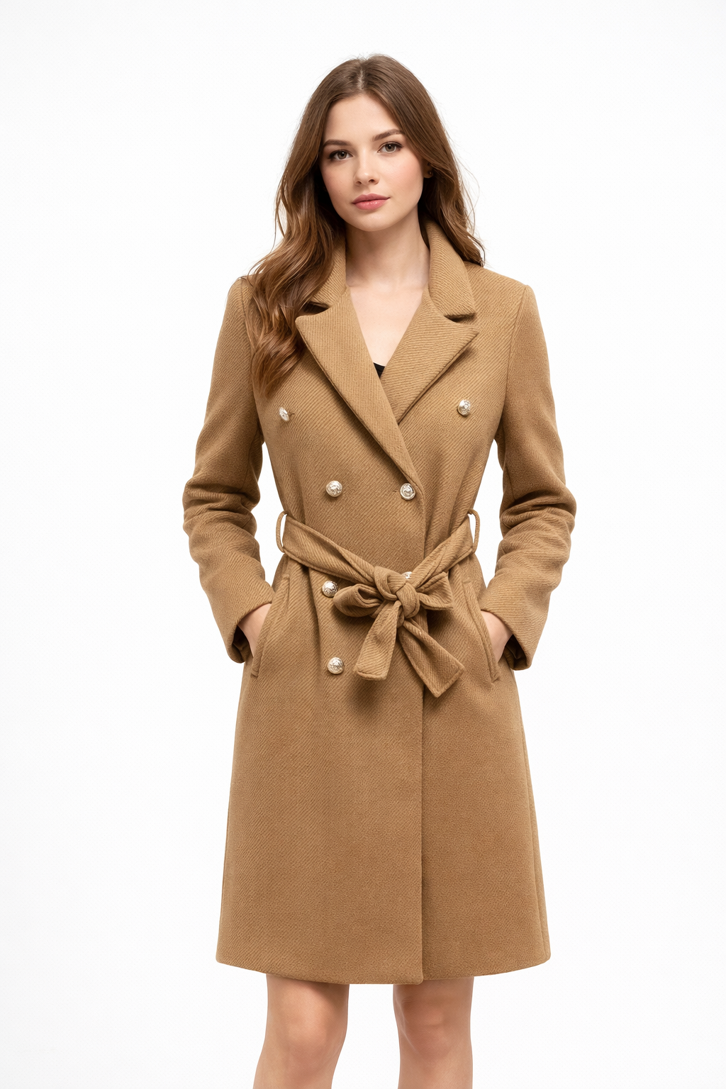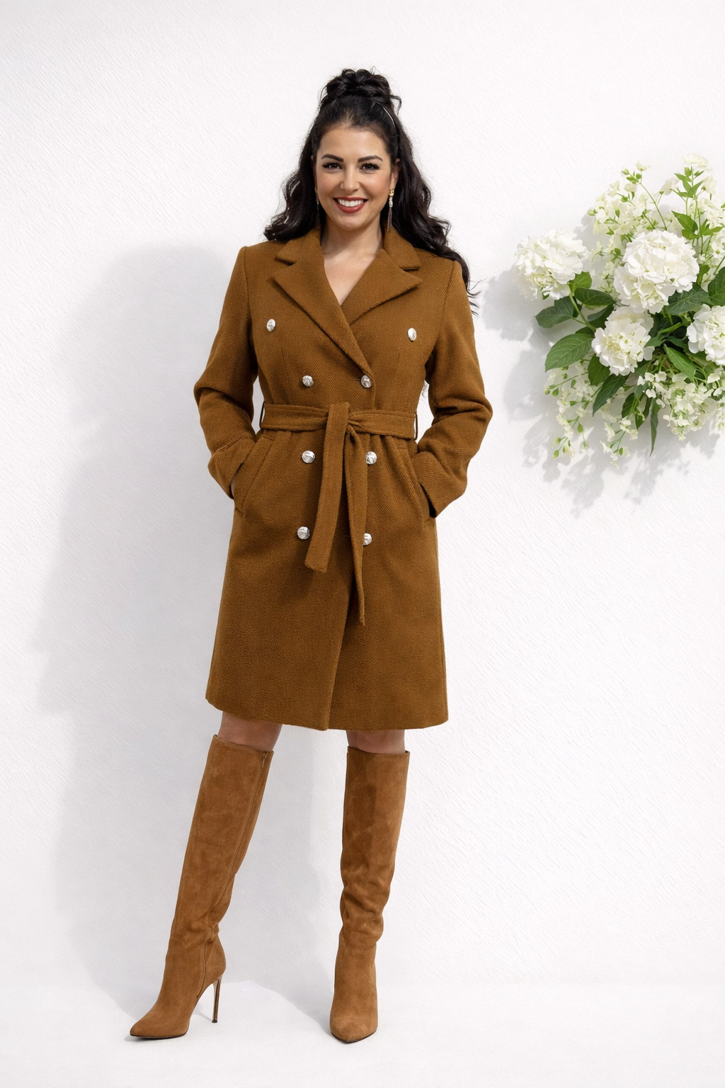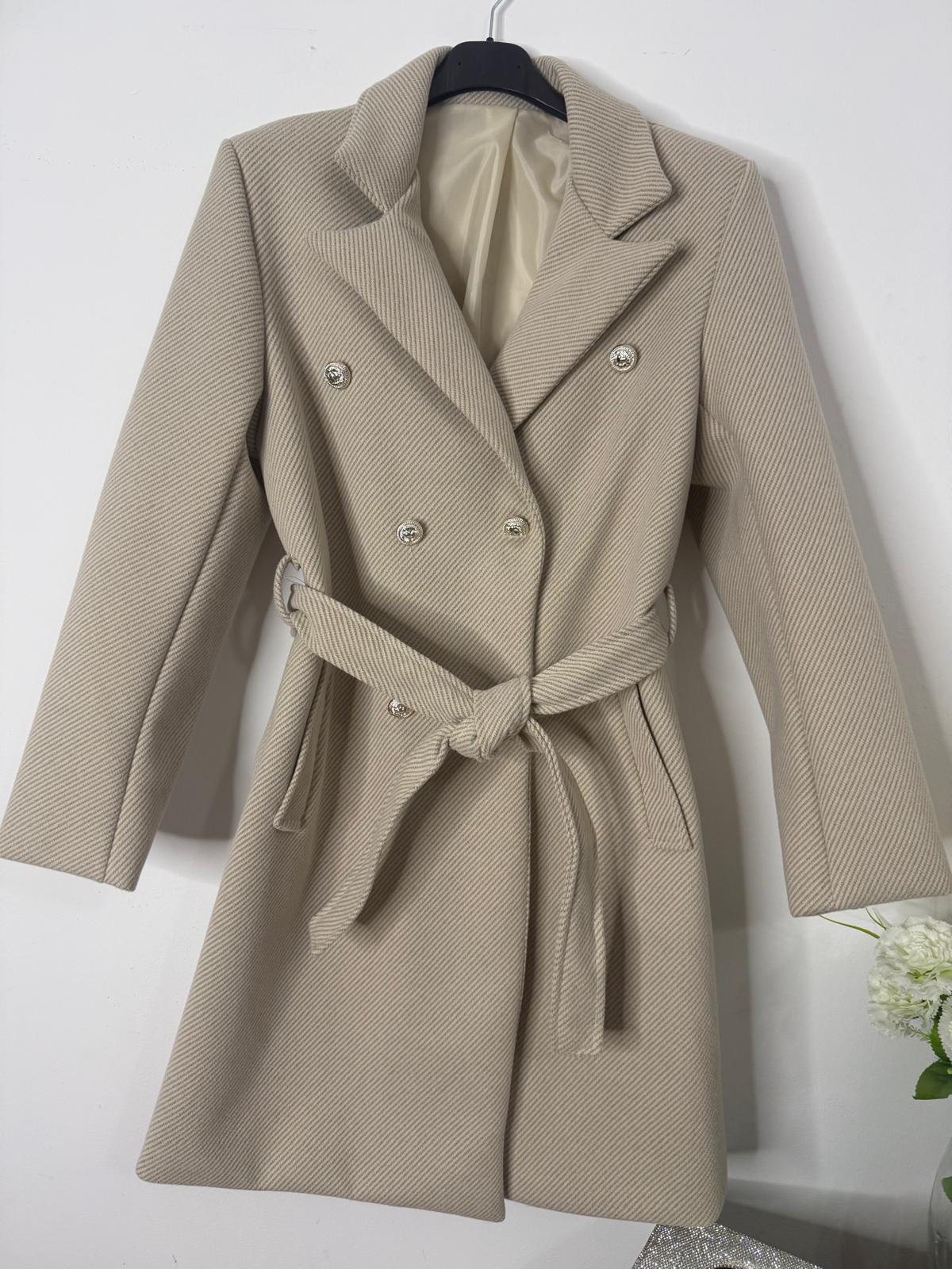Stylowy płaszcz wykonany z miękkiego, przyjemnego w dotyku materiału. Klasyczny krój pięknie układa się na sylwetce, a złote guziczki dodają mu elegancji i charakteru. Model posiada praktyczne kieszenie oraz pasek do wiązania w talii.