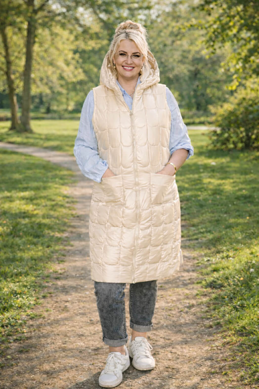 Lekki i wygodny bezrękawnik damski o nowoczesnym charakterze. Wyposażony w kaptur oraz praktyczne kieszenie, zapewnia funkcjonalność i komfort na co dzień. Zapinany na suwak, wykonany z miękkiego materiału – idealny na przejściową pogodę i codzienne stylizacje.