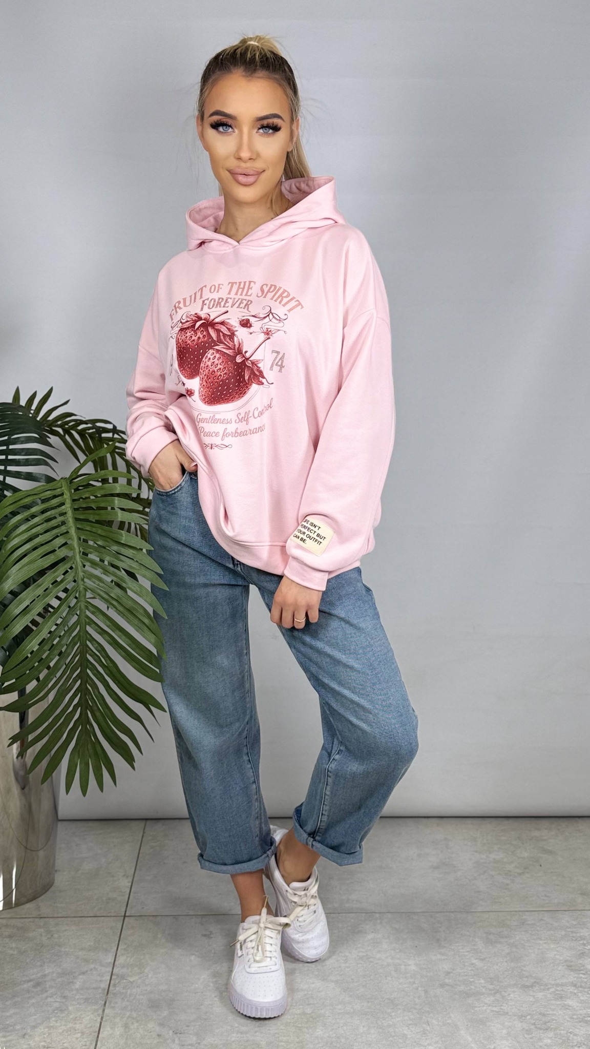 Oversizowa bluza bawełniana z kapturem o luźnym, wygodnym kroju. Posiada efektowną aplikację, która nadaje jej modnego charakteru. Świetnie sprawdzi się na co dzień – to po prostu fajna bluza, która łączy styl i komfort. Rozmiar uniwersalny pasuje na S–XXL.