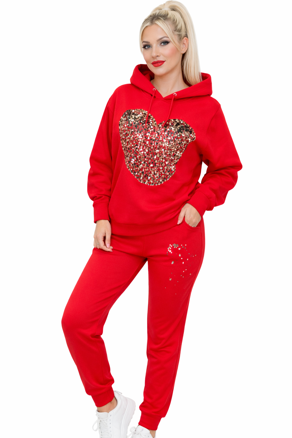 Bluza o klasycznym kroju, z kapturem, długim rękawem oraz dekoracyjną aplikacją z przodu. Spodnie z elastycznym pasem w talii, zwężane ku dołowi, z dekoracyjnymi elementami. Komplet przeznaczony do codziennego użytku.