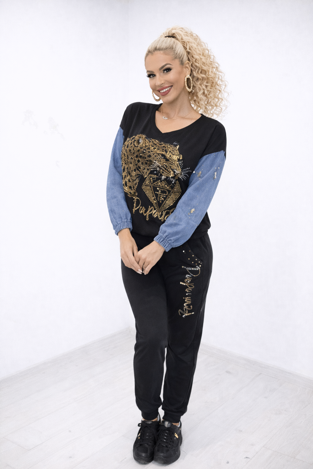 Stylowy dres oversize klasy premium, który łączy wygodę z modnym, luksusowym wyglądem. Model wyróżnia się efektownymi cekinkami oraz oryginalnymi rękawkami z dżinsu, które nadają całości niepowtarzalnego charakteru i przyciągają uwagę.