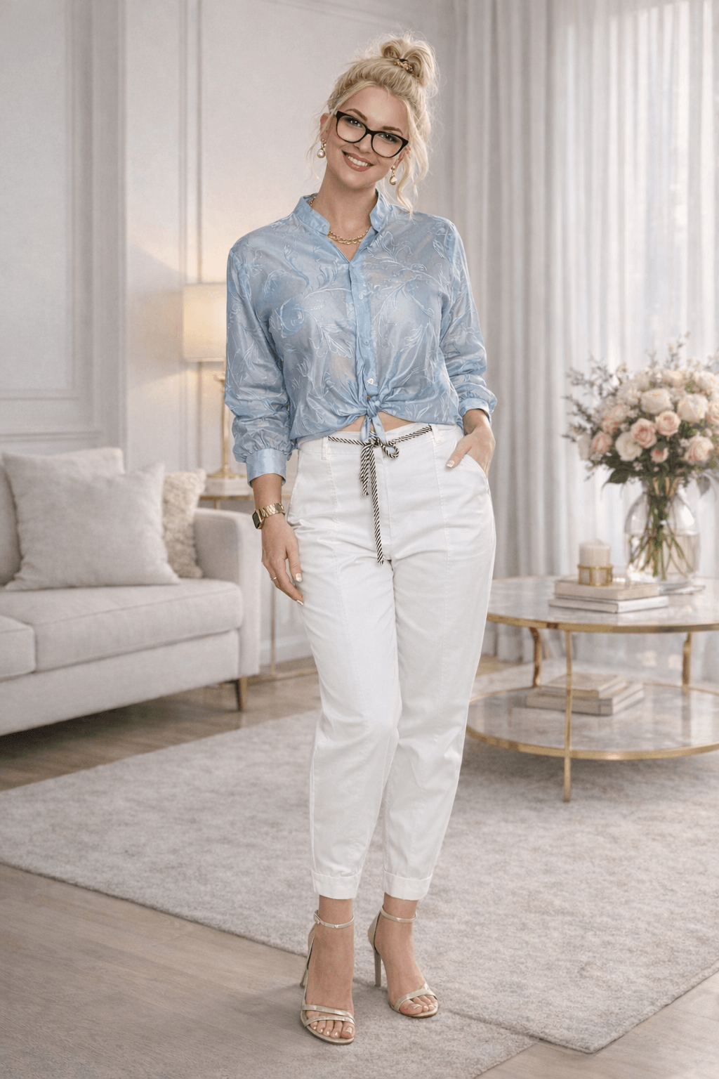 Bluzka posiada klasyczny kołnierzyk oraz możliwość stylizacji na dwa sposoby – możesz ją zawiązać z przodu w modny węzeł lub włożyć do spódnicy czy spodni, tworząc elegancki look. Rękawy zakończone są mankietami zapinanymi na guziki, co podkreśla jej ponadczasowy fason.