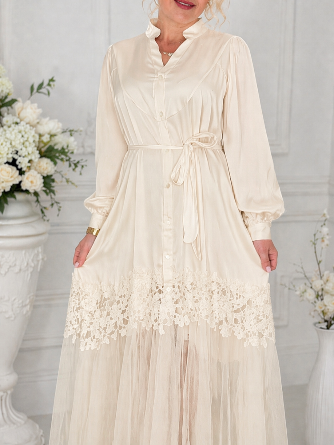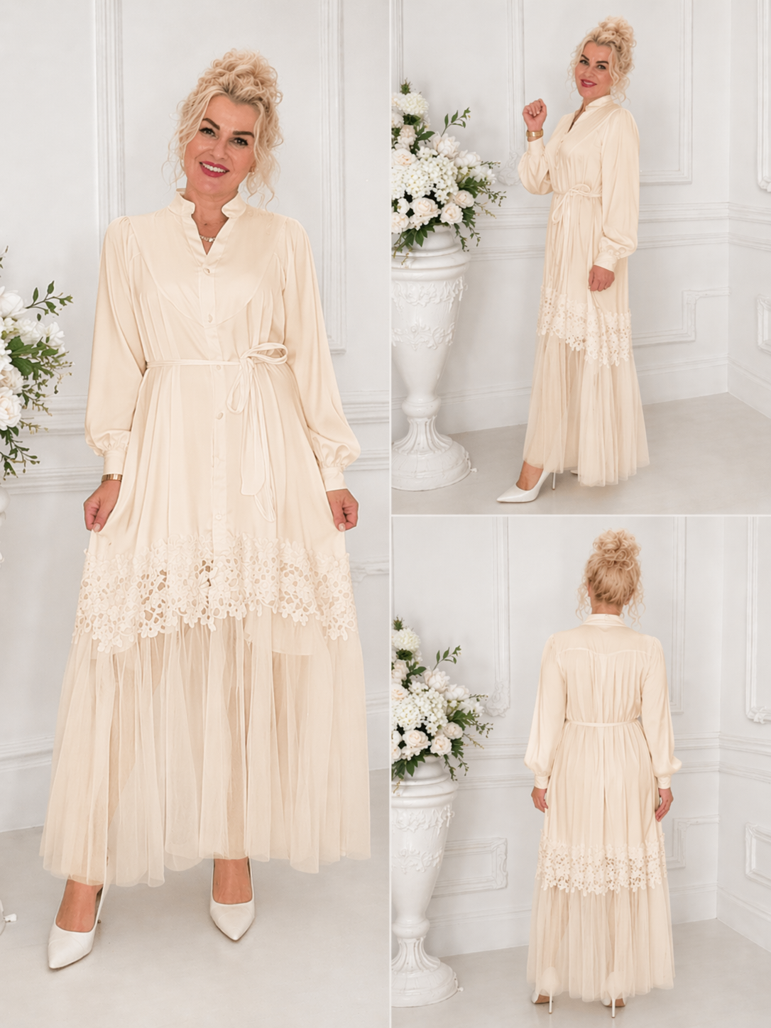 Elegancka sukienka midi w jasno-kremowym kolorze z delikatnym haftem i tiulowym wykończeniem – idealna na wyjątkowe okazje.