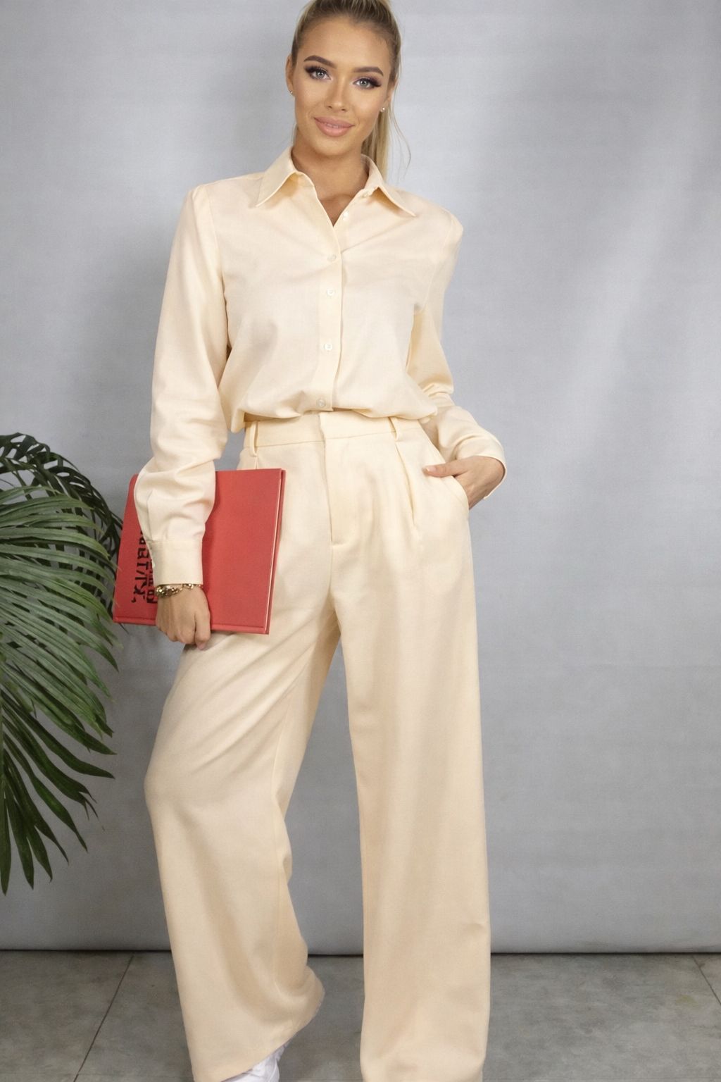 Zestaw obejmuje luźną koszulę, wygodne szerokie spodnie o modnym kroju oraz stylową marynarkę ozdobioną kokardami na kieszeniach. Model posiada praktyczne kieszenie. Całość wykonana jest z wysokiej jakości materiału, który pięknie się układa i zapewnia komfort noszenia.