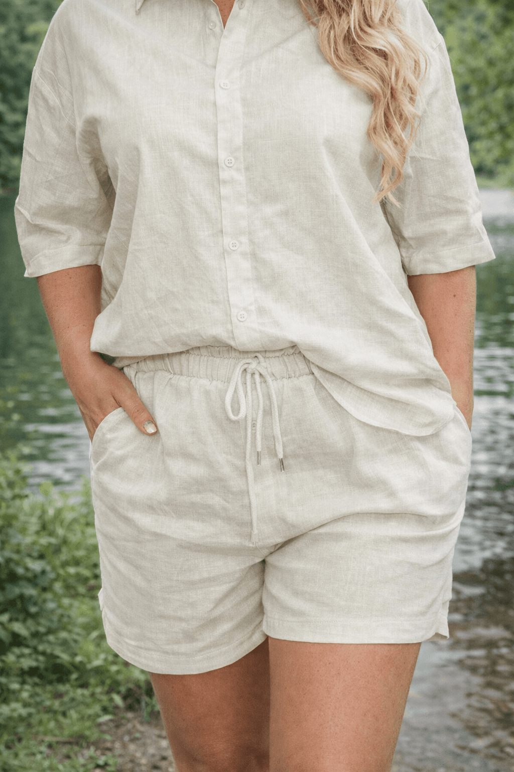 Modny i wygodny komplet damski to doskonała propozycja na sezon wiosna–lato. Dwuczęściowy zestaw składa się z klasycznej koszuli zapinanej na guziki oraz komfortowych szortów z elastyczną gumką w pasie i regulacją na sznurek, dzięki czemu idealnie dopasowują się do sylwetki.