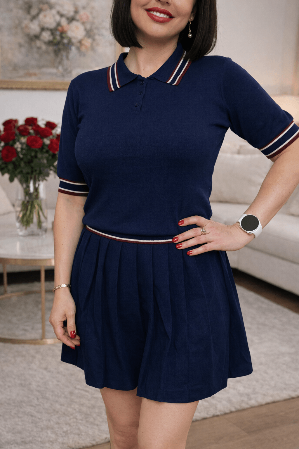 Sweterek z krótkim rękawem i kołnierzykiem to klasyka w nowoczesnym wydaniu. Subtelne detale oraz staranne wykończenie sprawiają, że komplet prezentuje się bardzo elegancko i stylowo.