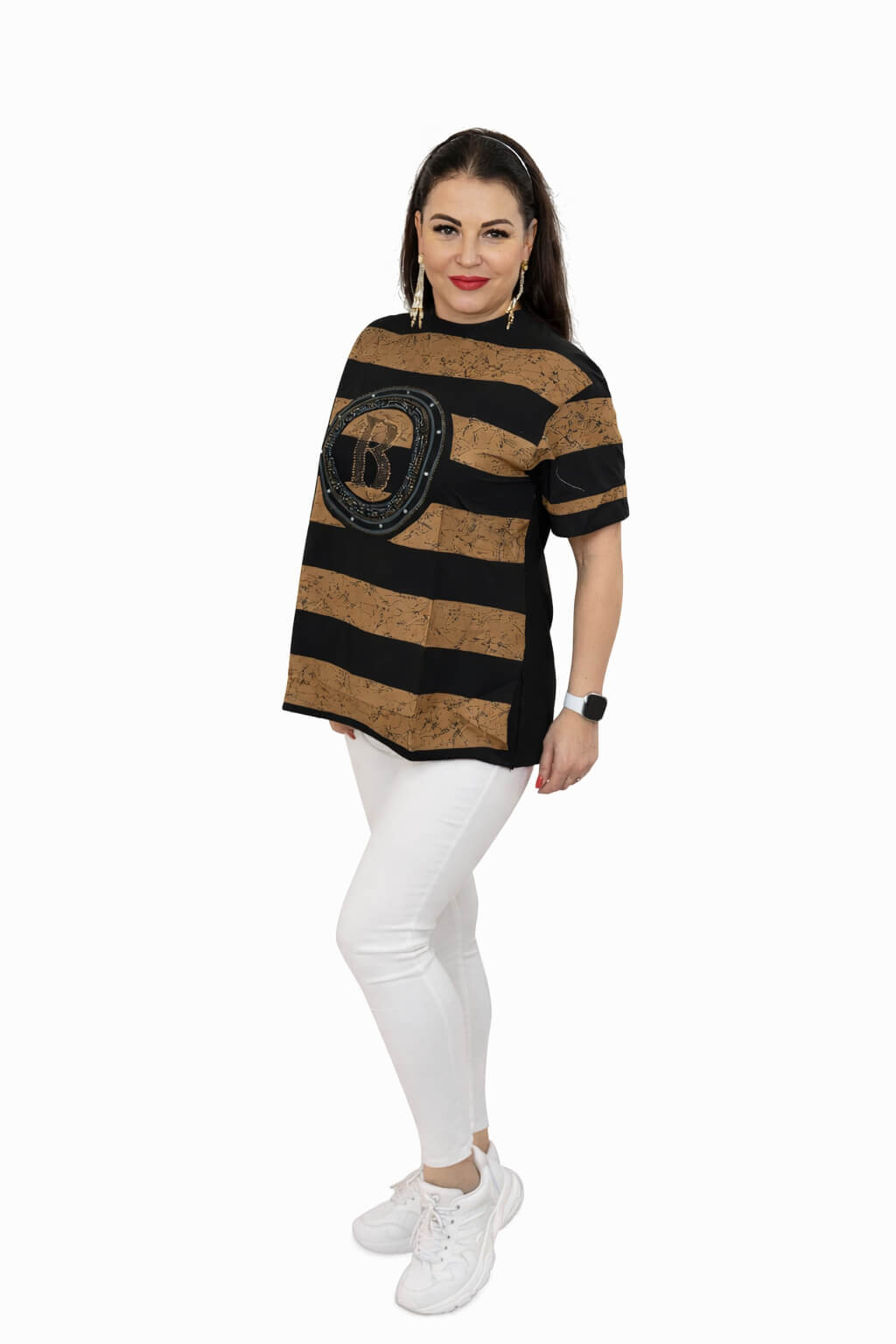 Damska koszulka z krótkim rękawem wykonana z wysokiej jakości dzianiny bawełnianej z dodatkiem elastanu. Model w poziome paski w kolorze czarnym i złotym, z dekoracyjnym nadrukiem na przodzie. Klasyczny krój zapewnia wygodę noszenia i swobodę ruchów.