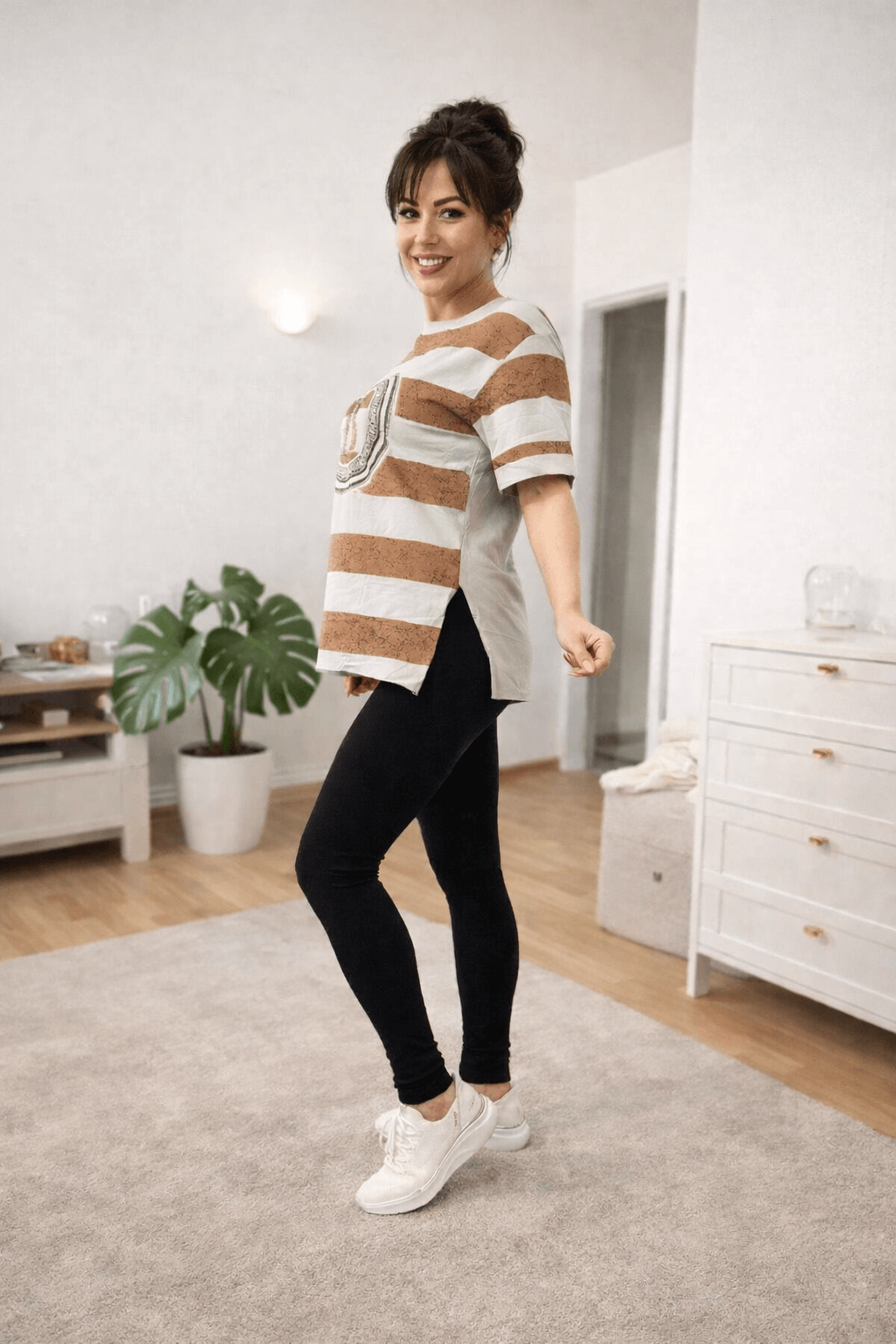 Stylowa koszulka w modny, ponadczasowy wzór w poziome paseczki w odcieniach beżu i bieli. Subtelne, eleganckie pasy nadają jej nowoczesnego, a jednocześnie uniwersalnego charakteru.