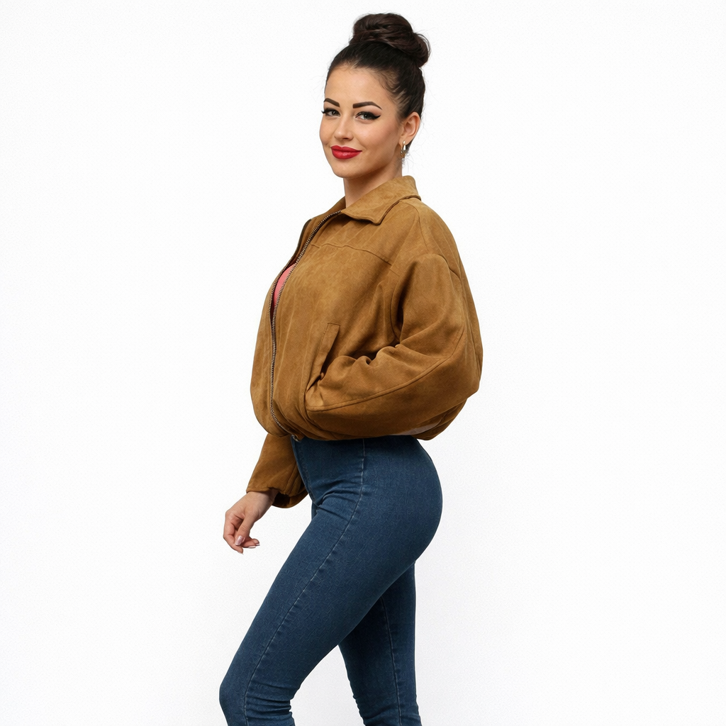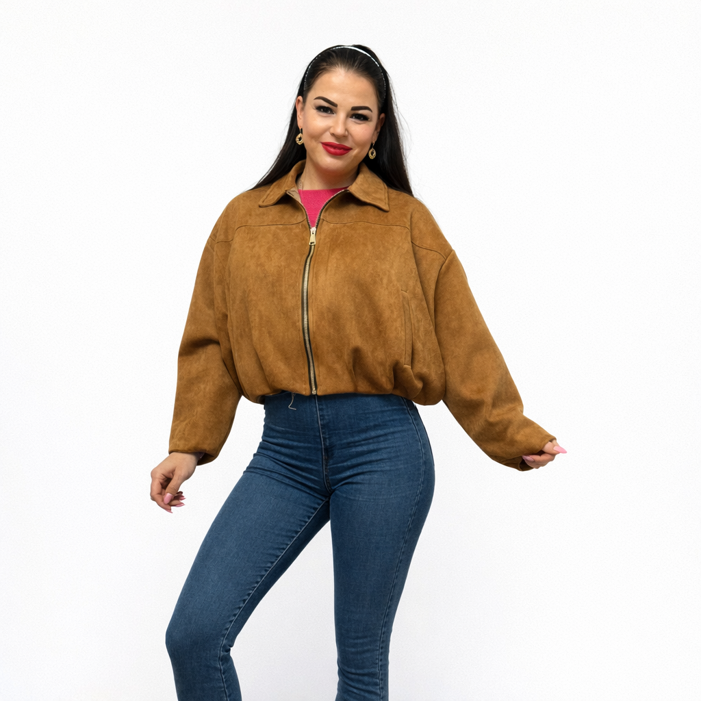 Modna kurtka zamszowa o krótkim fasonie, zapinana na zamek błyskawiczny. Wykonana z miękkiego materiału, z podszewką w środku, zapewnia komfort noszenia i świetnie układa się na sylwetce. Idealna do codziennych stylizacji – pasuje zarówno do jeansów, jak i sukienek.