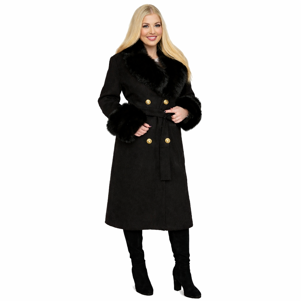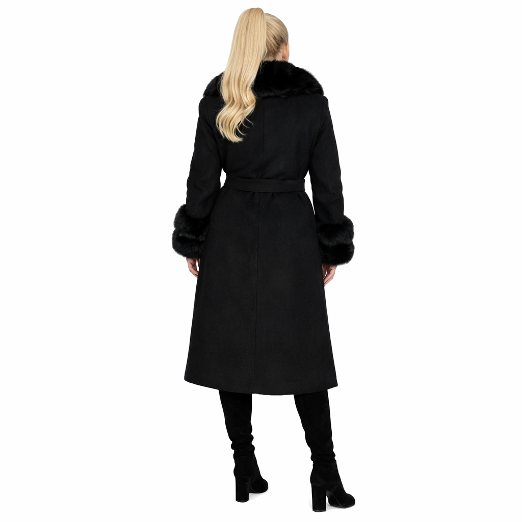 Model został wykończony naturalnym futrem z lisa przy kołnierzu oraz mankietach, co nadaje mu ekskluzywnego charakteru i subtelnej elegancji. Miękkie, puszyste futro pięknie podkreśla linię płaszcza i dodaje stylizacji luksusowego wyrazu.