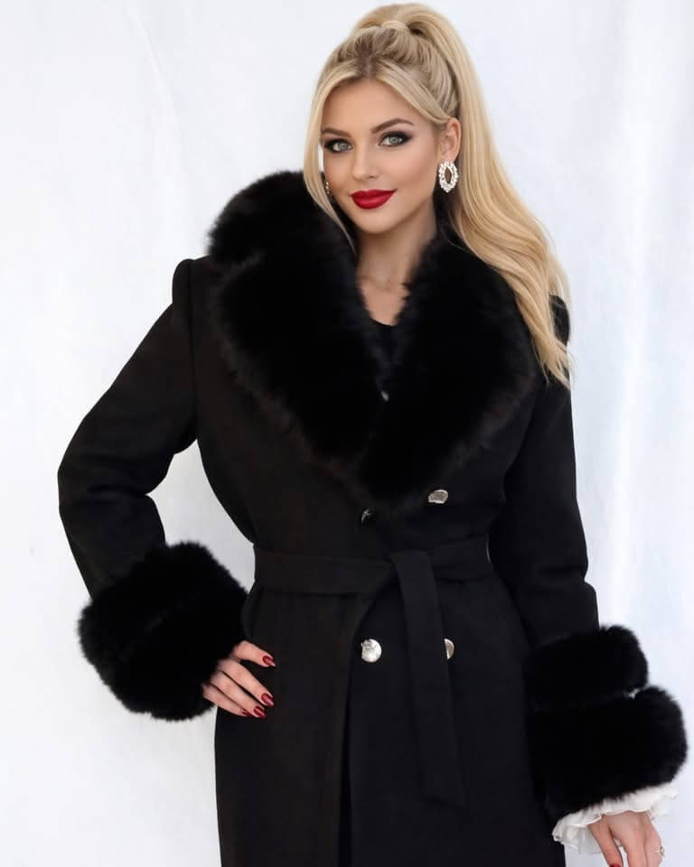 Wełniany płaszcz damski z naturalnym futrem lisa – płaszcz za kolano na guziki z paskiem