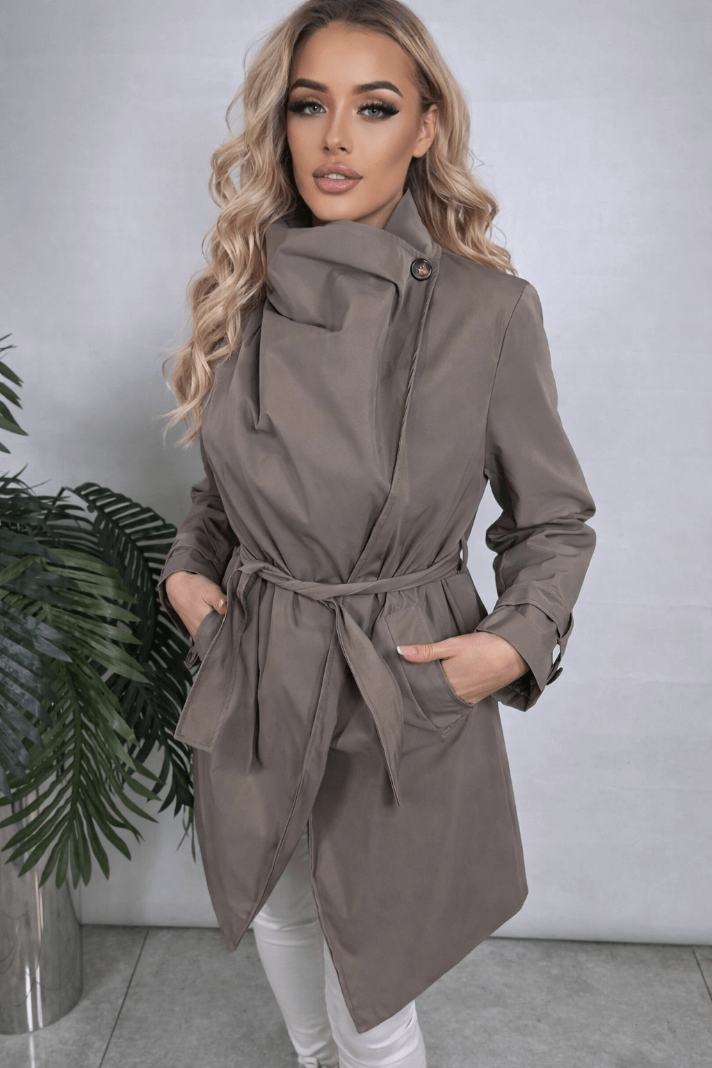 Stylowy, krótki płaszczyk wykonany z przyjemnego materiału płaszczowego. Model zapinany na guziczki, dodatkowo posiada pasek w talii, który pięknie podkreśla sylwetkę i pozwala na idealne dopasowanie.