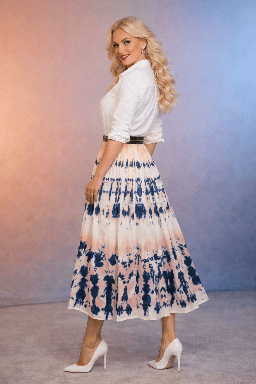 Stylowa spódnica midi o wyjątkowym, artystycznym wzorze, wykonana z wysokiej jakości materiału, który pięknie układa się na sylwetce. Model posiada podszewkę, dzięki czemu jest komfortowy w noszeniu i nie prześwituje.