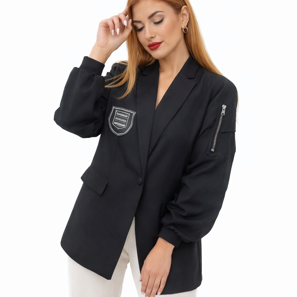 Marynarka damska o kroju oversize, wykonana z materiału zawierającego poliester. Tkanina jest miękka i przyjemna w dotyku. Model posiada kieszenie z przodu oraz dodatkową kieszonkę na rękawie. Rękawy zakończone ściągaczami. Marynarka zapinana na guzik. Rozmiar uniwersalny.