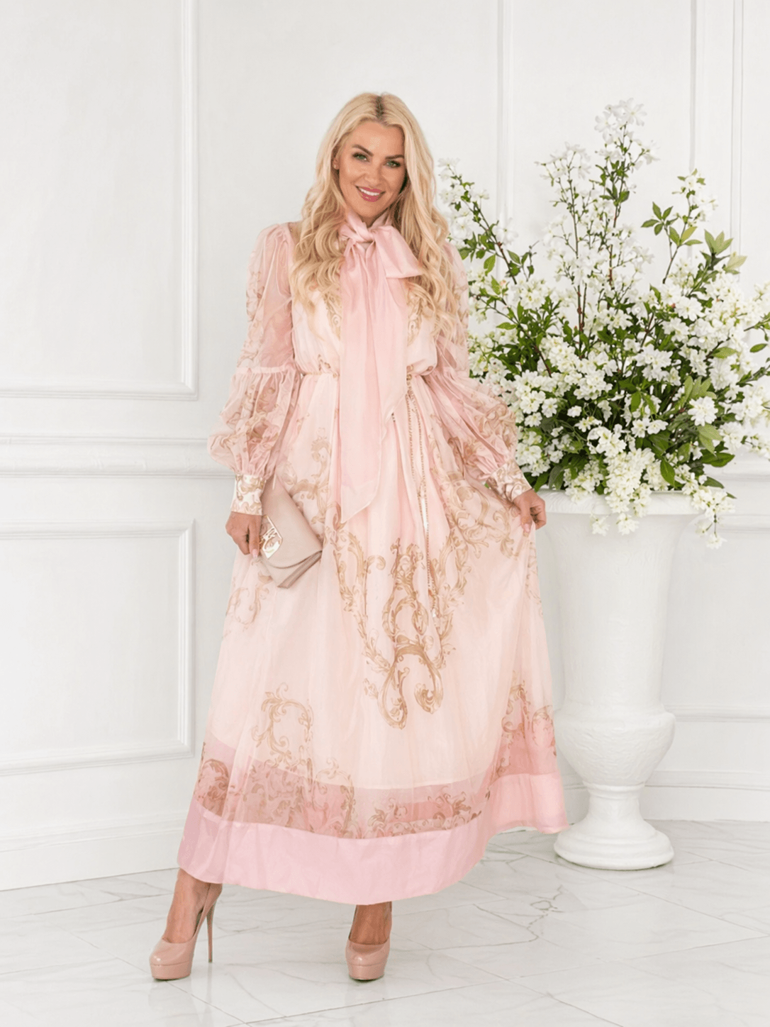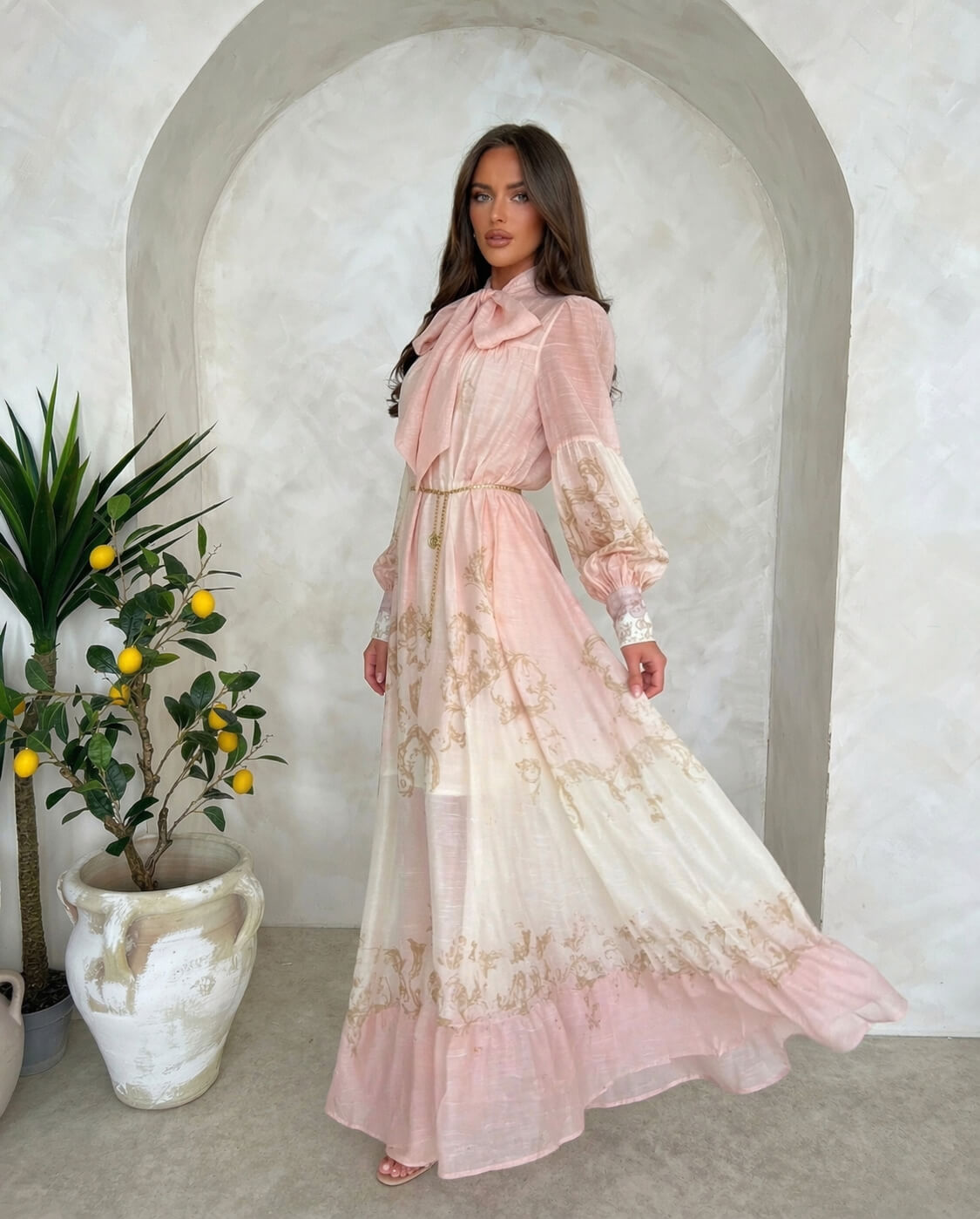 Sukienka w odcieniach beżu i pastelowego różu to wyjątkowo kobiecy, zwiewny model na każdą okazję. Elegancki fason z falbaną, długim rękawem i złotym paskiem pięknie podkreśla sylwetkę i dodaje stylizacji klasy.