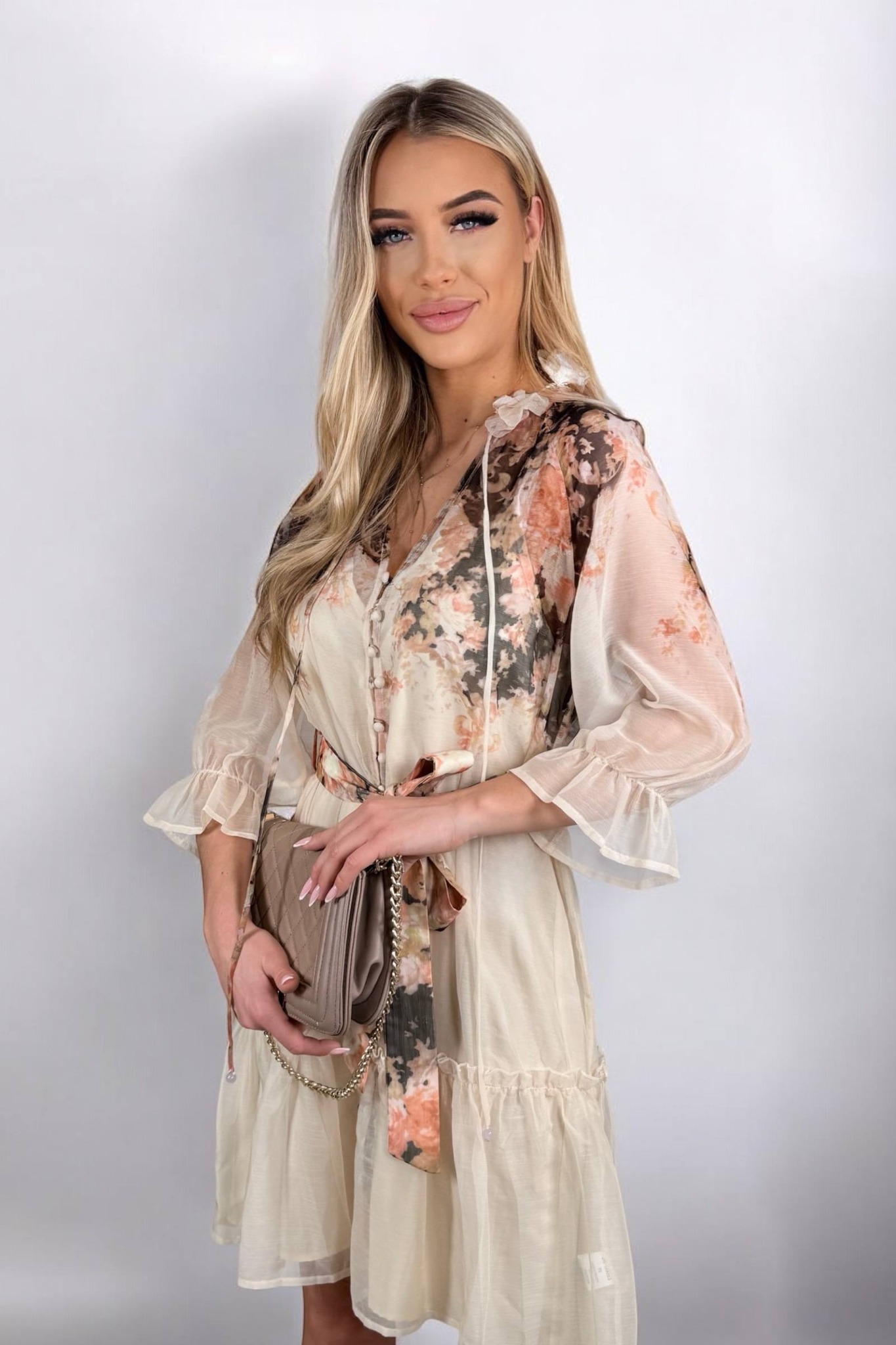 To bardzo ładna, lekka sukienka jak mgiełka. Ma rękawy 3/4 zakończone delikatnymi falbankami. Przy szyi znajduje się falbanka wiązana na sznurek, a z przodu ozdobne guziczki dodają jej uroku. W talii jest regulowana na gumce, dzięki czemu ładnie dopasowuje się do sylwetki. Na dole również posiada falbankę.