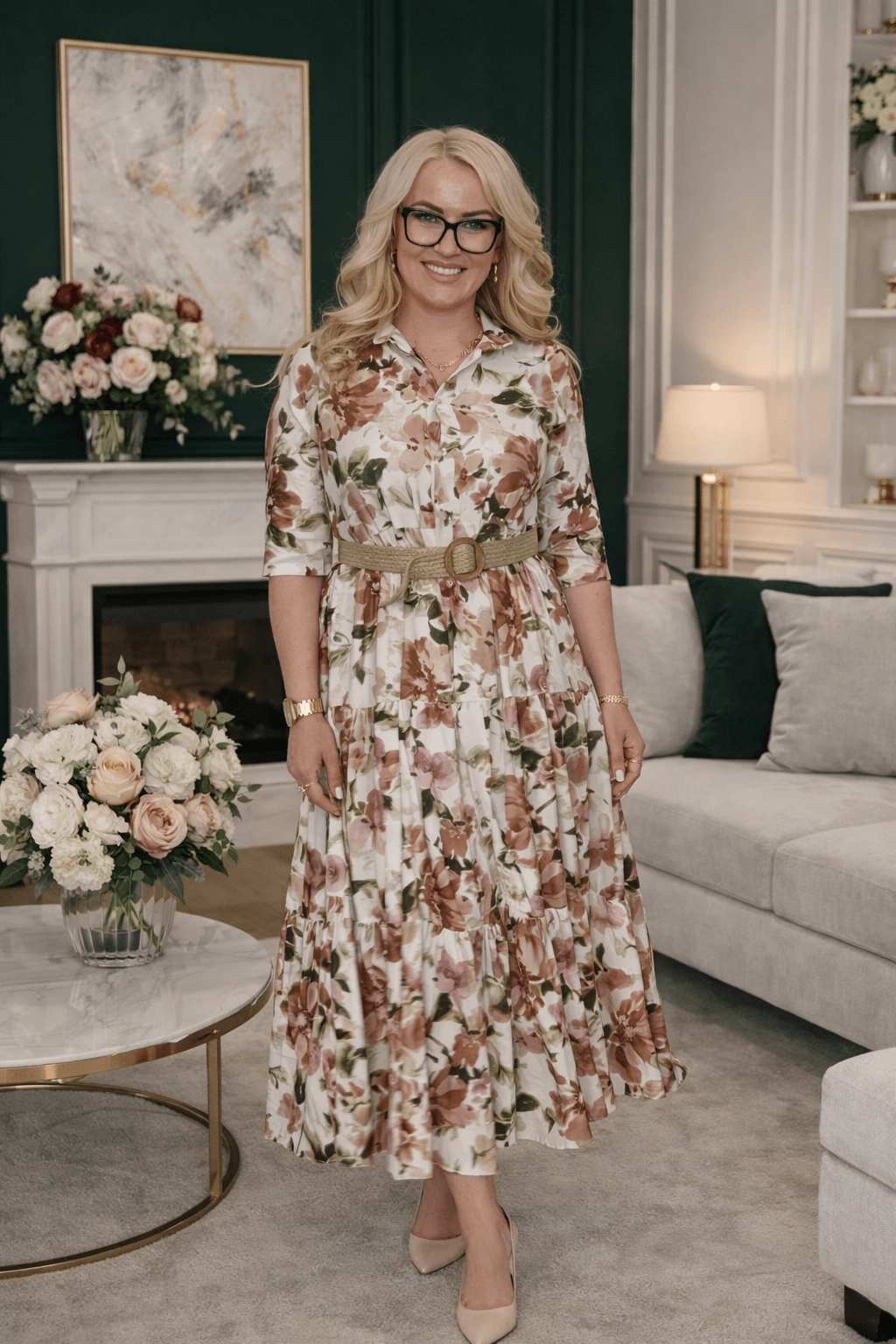 Sukienka koszulowa w kwiaty z paskiem – lekka letnia sukienka midi z falbaną
