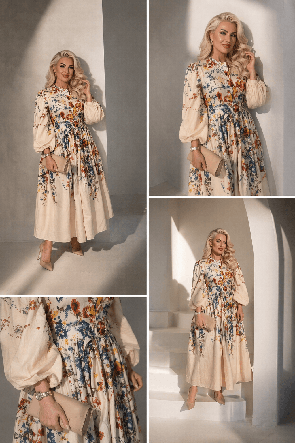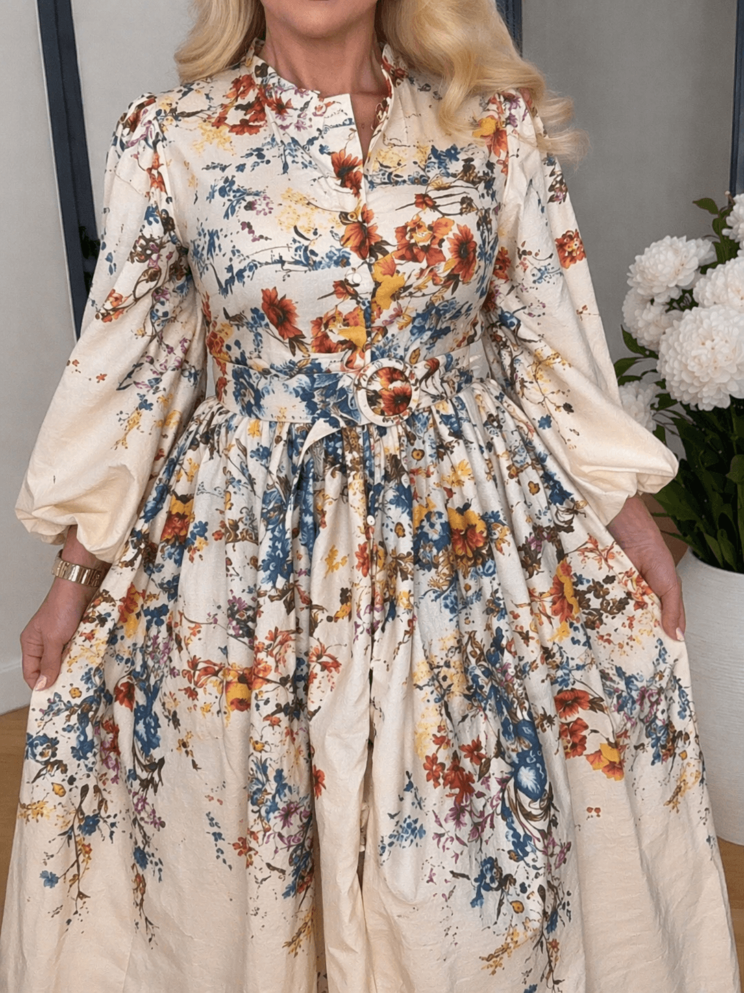 Długa sukienka w kwiaty o kobiecym kroju, z paskiem i ozdobnymi guziczkami – idealna na wyjątkowe okazje.