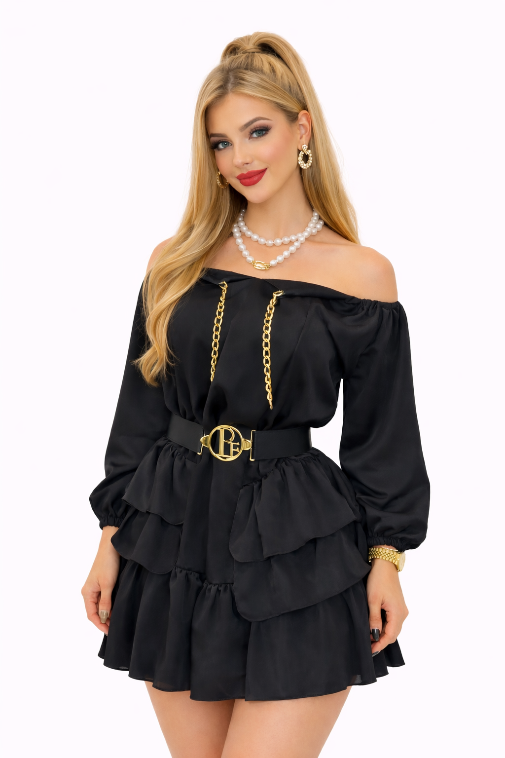 Elegancka czarna sukienka damska w stylu hiszpanki, wykonana z lekkiego i zwiewnego materiału. Model z długim rękawem oraz dekoracyjnymi falbankami, które nadają sukience kobiecego charakteru. Klasyczny krój sprawdzi się zarówno na co dzień, jak i na okazjonalne wyjścia. Sukienka zapewnia komfort noszenia i swobodę ruchów.
