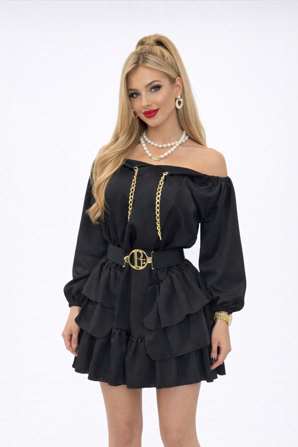 Model z odkrytymi ramionami subtelnie eksponuje dekolt, a falbanowa spódnica dodaje sukience romantycznego charakteru i delikatnego ruchu. Złote detale w postaci ozdobnych łańcuszków oraz elegancki pasek z klamrą nadają całości luksusowego wykończenia. Długie rękawy zakończone gumką zapewniają komfort noszenia i uniwersalność stylizacji.