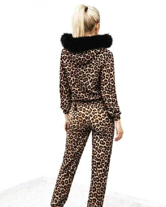 Kostium jest piękny, stylowy i dopracowany w każdym detalu. Bluza posiada kapturek wykończony mięciutkim futerkiem, który dodaje całości luksusowego charakteru i przytulności. Z przodu znajduje się złoty zamek błyskawiczny, stanowiący efektowny i elegancki akcent.