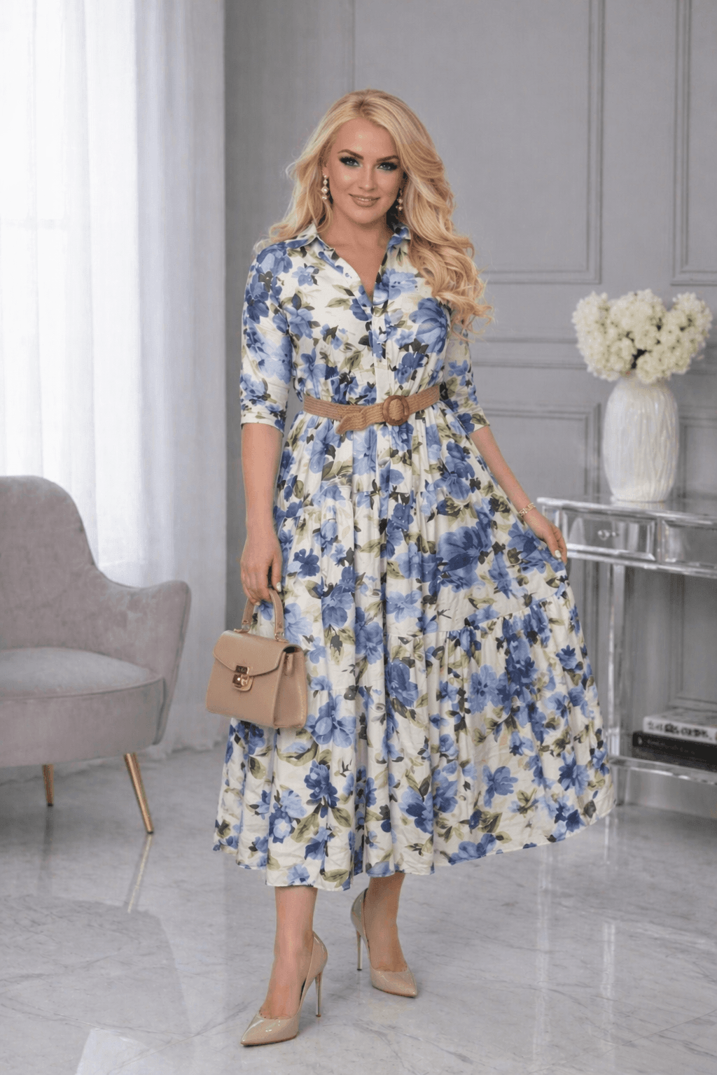 Elegancka sukienka o kobiecym, zwiewnym kroju, który pięknie podkreśla sylwetkę. Model z delikatnym kołnierzykiem, rękawem o komfortowej długości oraz talią zaznaczoną paskiem, nadającą całości szyku i proporcji. Lekki, miękko układający się materiał sprawia, że sukienka doskonale sprawdzi się zarówno na co dzień, jak i na bardziej wyjątkowe okazje.
